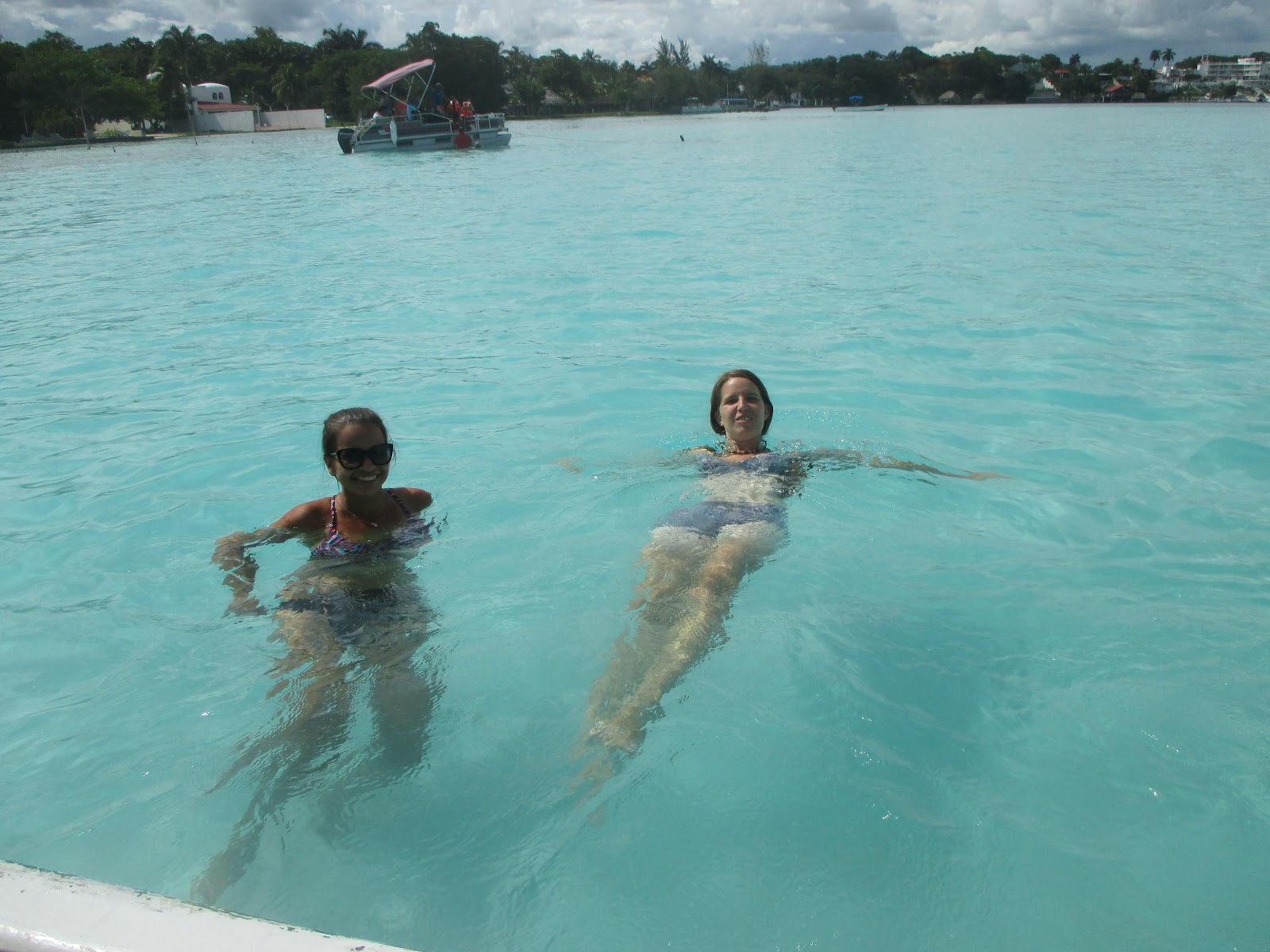 Nakonec jsme to přece jen nějak zvládly a nastoupily do loďky už plné různorodé společnosti. Původní nabídka slevy při počtu alespoň 10 lidí se nakonec nekonala, ale i tak jsme byly za projížďku rády, protože bez ní bychom z jezera nic neměly. Jak jsme projížděli podél břehů, bylo vidět, že k vodě se ze všech stran dá dostat jen ze soukromých pozemků. Voda v laguně je průzračně azurově modrá, protože je na většině míst mělká a má písčité dno. Když se projíždíte člunem uprostřed jezera, není nic divného potkat tam lidi, jak se koupou a vodu mají jen po krk. Na několika místech se ale nachází cenote, přírodní studny, které jsou součástí jezera a jsou hluboké desítky metrů. V mělké i hluboké vodě jsme se zastavili na vykoupání, projeli jsme také kolem Ostrova ptáků, kde hnízdí pelikáni, plameňáci a spatuly rosy a asi ještě hromada dalších vodních ptáků.